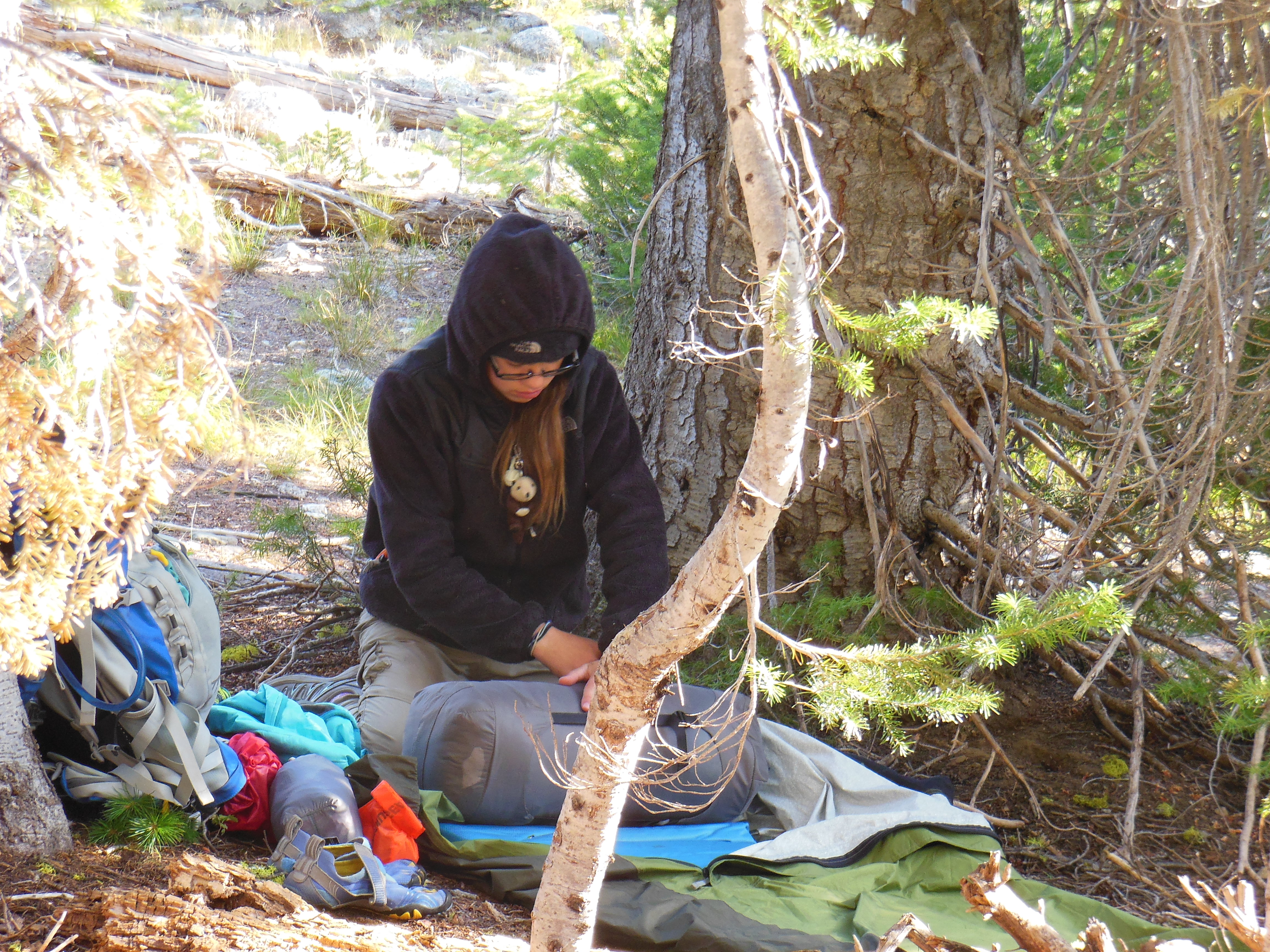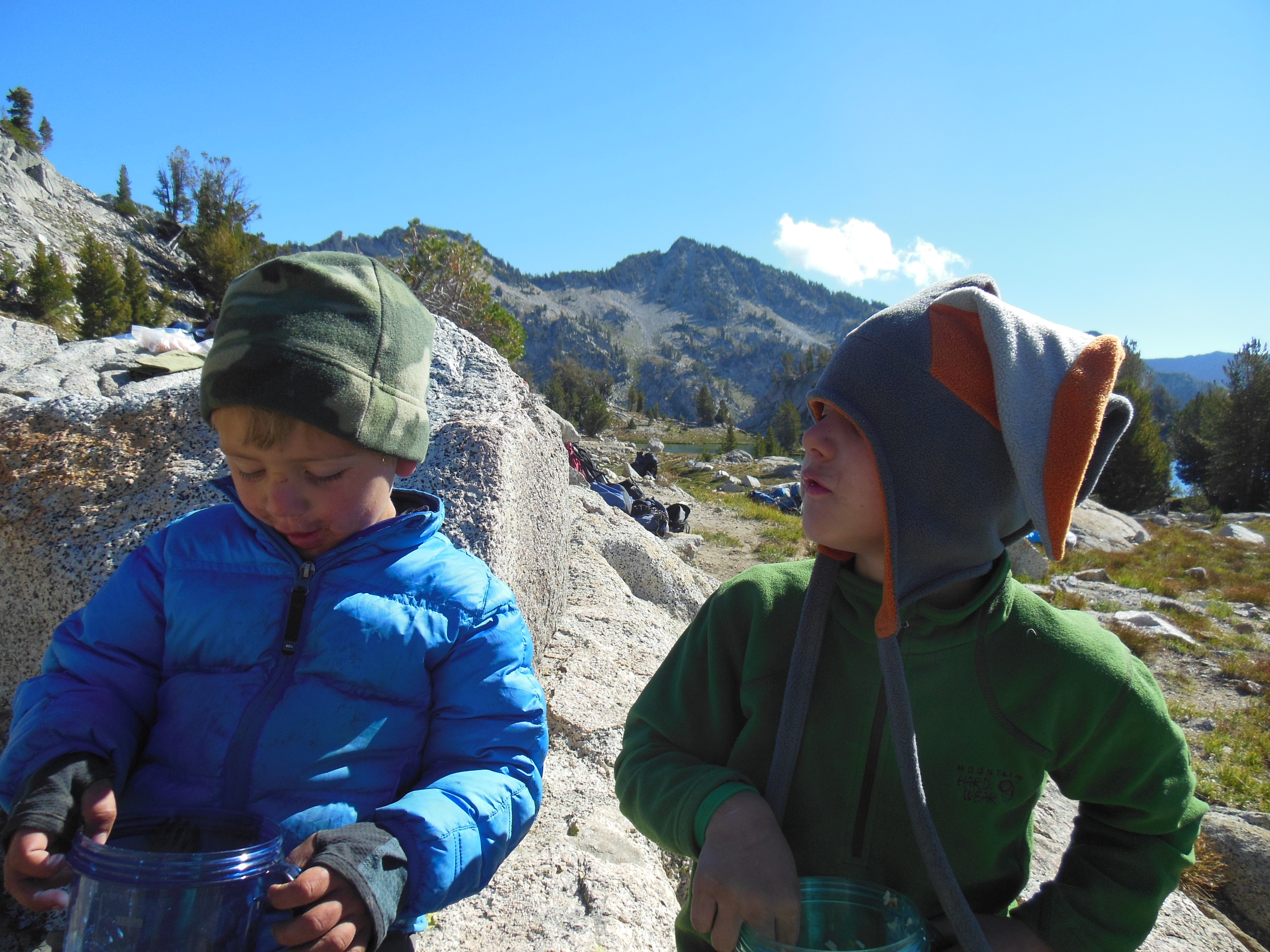 It was an early morning start, and we ate oatmeal for breakfast. We packed up all of our packs, left them at camp, and headed off to Moon Lake. Cory stayed behind to finish packing up everything, and Ellie entertained Keenan and Rhys with stories during the hike.