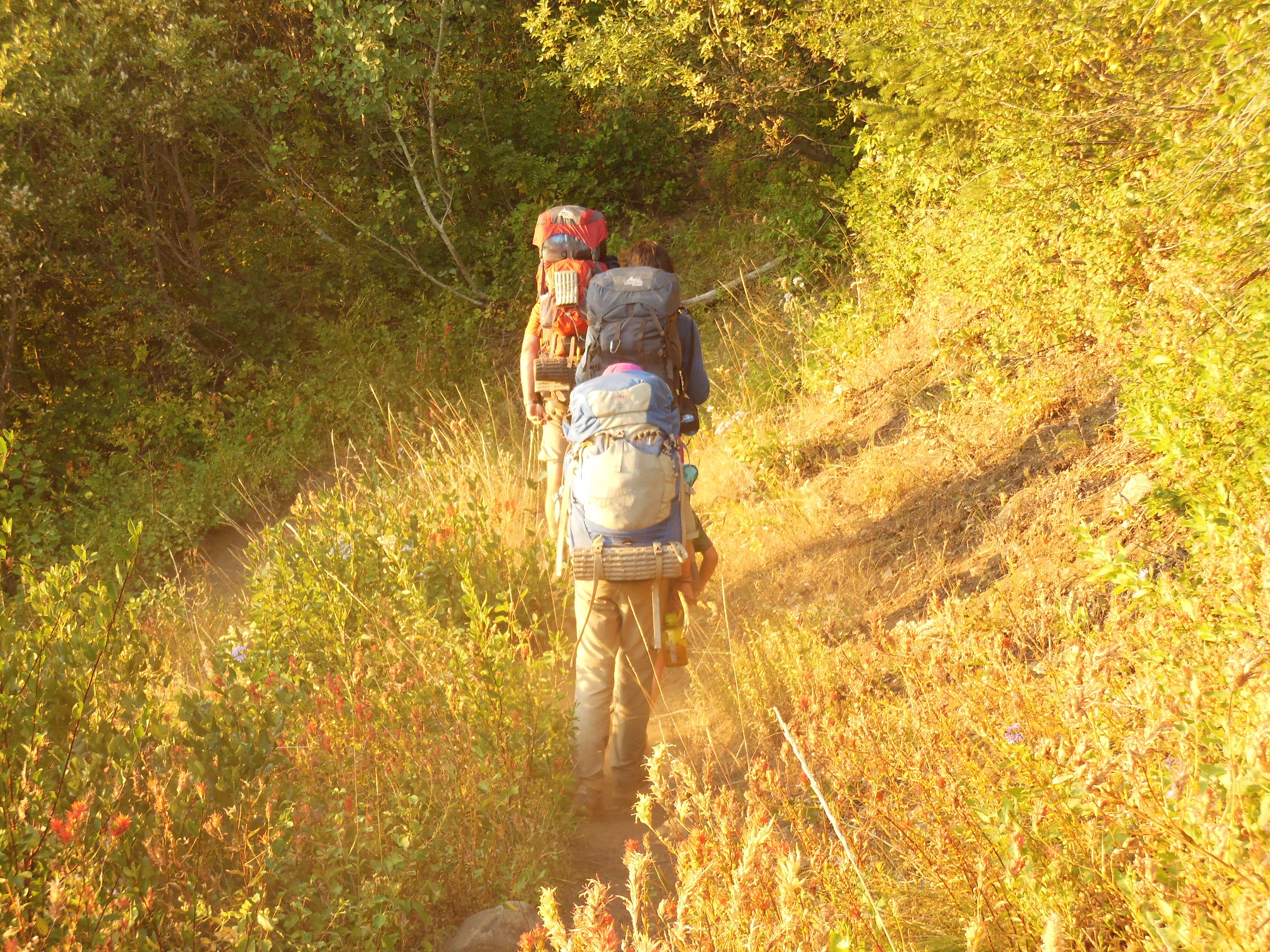 Bright and early, Cory scouted the trails and discovered where we had gone wrong the night before. It was only about a mile back, but we could have avoided Rhys falling in the creek if we would have seen the right path at the right time. Breakfast was Grapenuts with milk and strawberries, and then we began a trail-cutting trek across the creek and up and down the ravine to locate our trail once again.